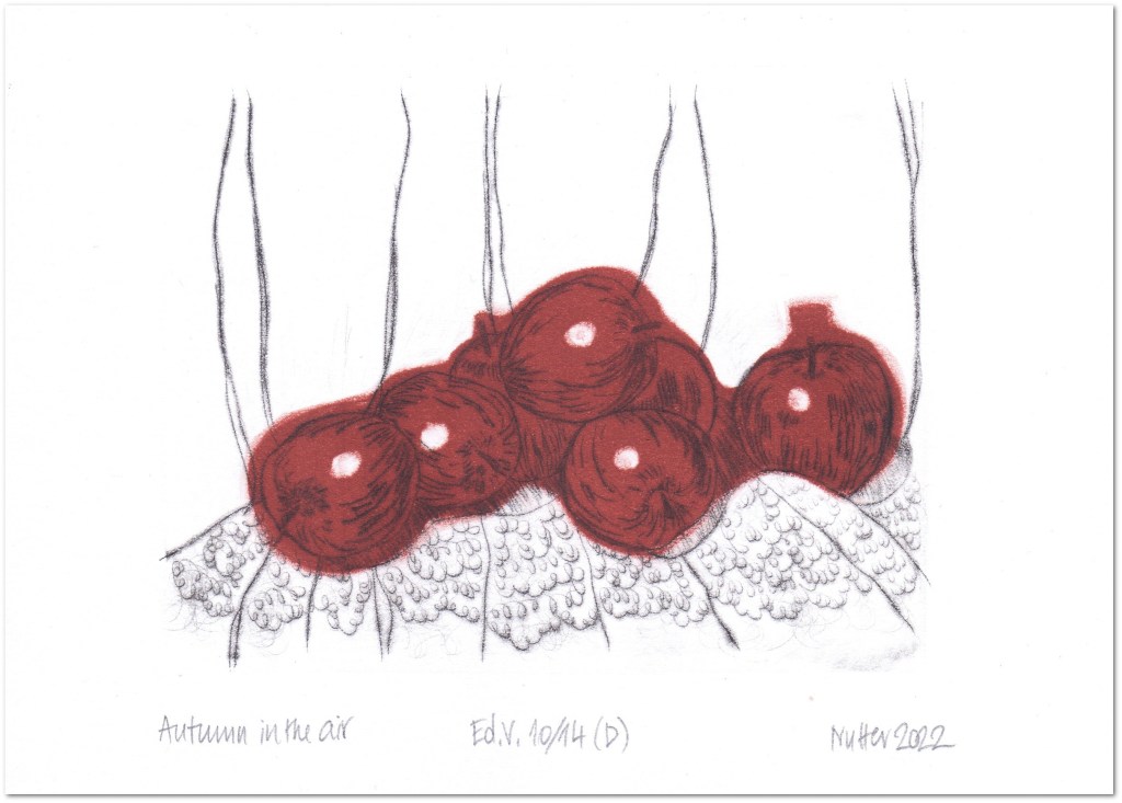 Autumn in the Air (Red) Ed. V. 10/14 (D) drypoint combined with monotype hand-printed size: 29 x 21 cm plate size: 12 x 15 cm paper 120g / white / acid-free 2022 £ 15