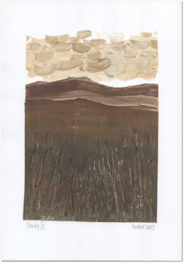 Study IV monotype combined with watercolour pencils hand-printed size: 29,7 x 21 cm (A4) image size: 22 x 15,5 cm paper 120g / white / acid-free 2023 £ 15